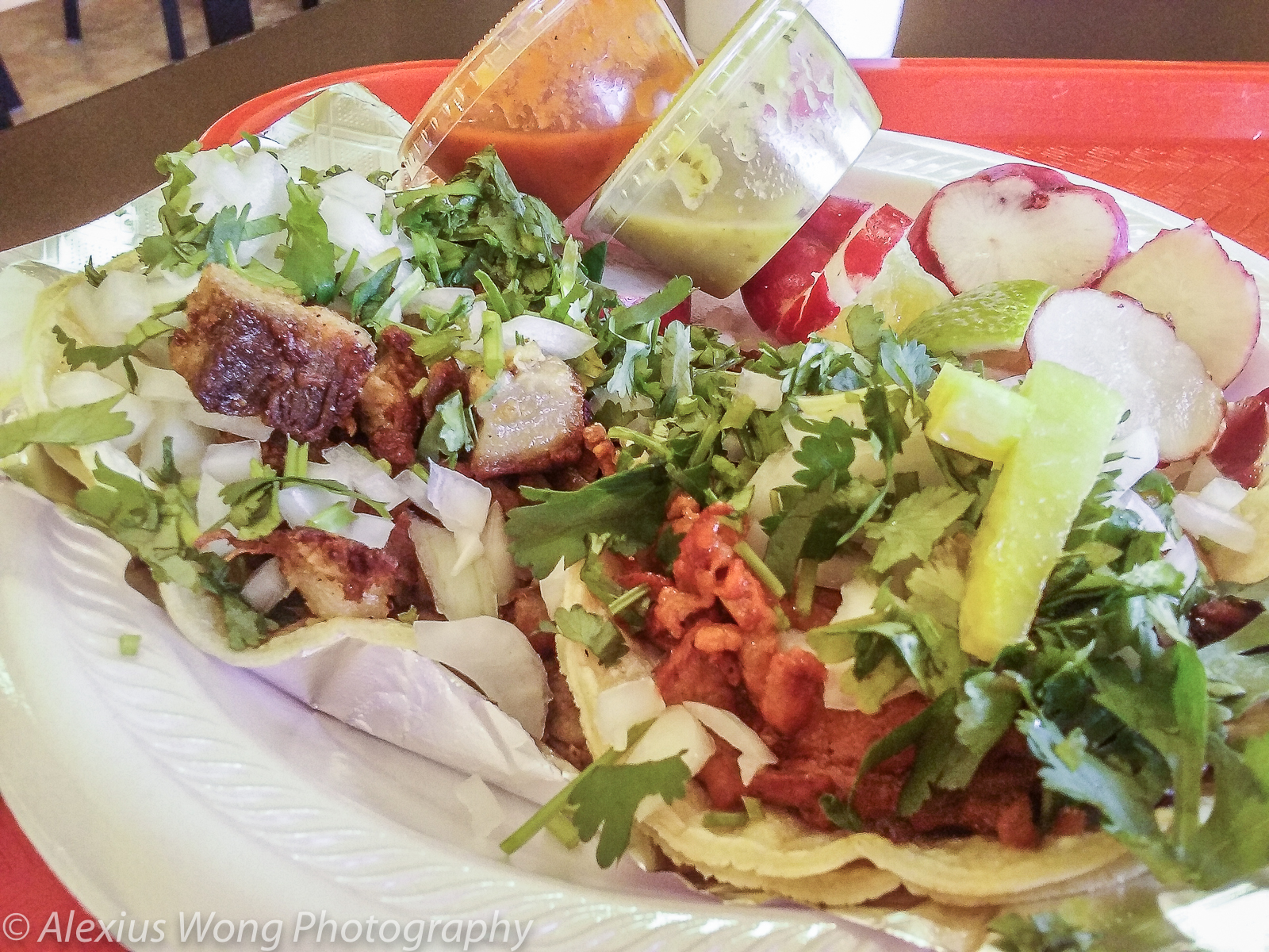 Along with the first dish above, my BFF had also raved about the tacos offered here. My order one day was made with Carnitas and the other Al Pastor. One bite into the Carnitas one blew me away instantly. The pieces of pork were perfectly seasoned and cooked while maintaining some of its moisture and porcine goodness. The highlight to these meaty bites was the skin cooked to a crisp that gave some crunchy interest and its amazing bacon-like goodness. The Al Pastor ones were fairly tasty with the thin slivers of seasoned meat made red with some coloring probably from the achiote seed. However, it lacked the burnt meat flavor that the former exuded. The topping of fresh pineapple was interesting that made these bites more intriguing. The side green and red chile sauces were more than adequate with the green one lending some spicy fruity acid flavors and the red one some salty smoky dried chili notes, both elevating these soft tortilla bites to another level.