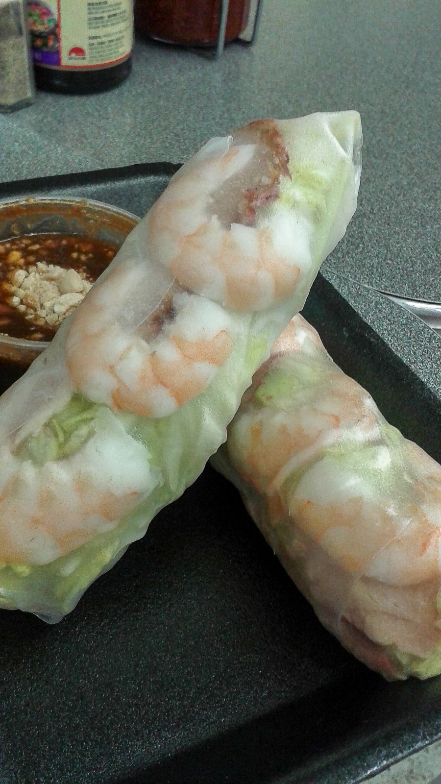 Cha Giao/Spring RollsNo trip is made to a Vietnamese establishment without trying their famous appetizers. Since summer was around the corner, I ordered the Summer Rolls. The rolls were properly made with lettuce, rice noodles, boiled shrimp and slices of pork. The sauce was a nice mixture of home-made-tasting sweet sauce, chili paste, and peanuts. The bite was properly made but  it could have done with some nice aromatic herbs like basil or mint, and I found the wrapping skin a bit too chewy – the owner confessed to me that making them fresh with a softer wrap was a challenge for the moment, which is a shame. However, the Spring Rolls were a vegetarian delight with a filling made with vegetables and the rare use of taro root which added a certain unctuousness. The side sauce mixture was a balanced mixture of fish sauce, garlic, sugar, and lime juice which made it the obligatory and perfect partner to these fried rolls.